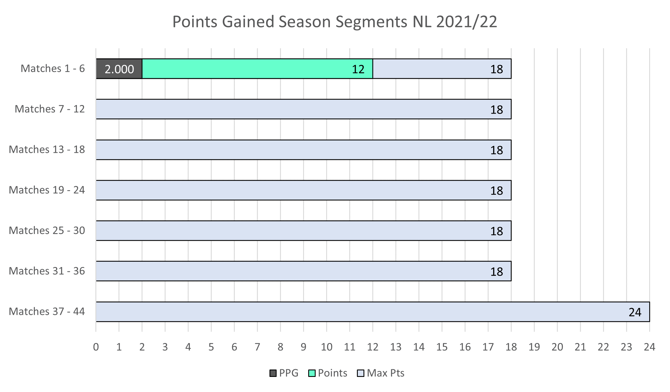 Six game segments updated. 12 Points for this first six games compared to 9 points accrued in the first six games last season.