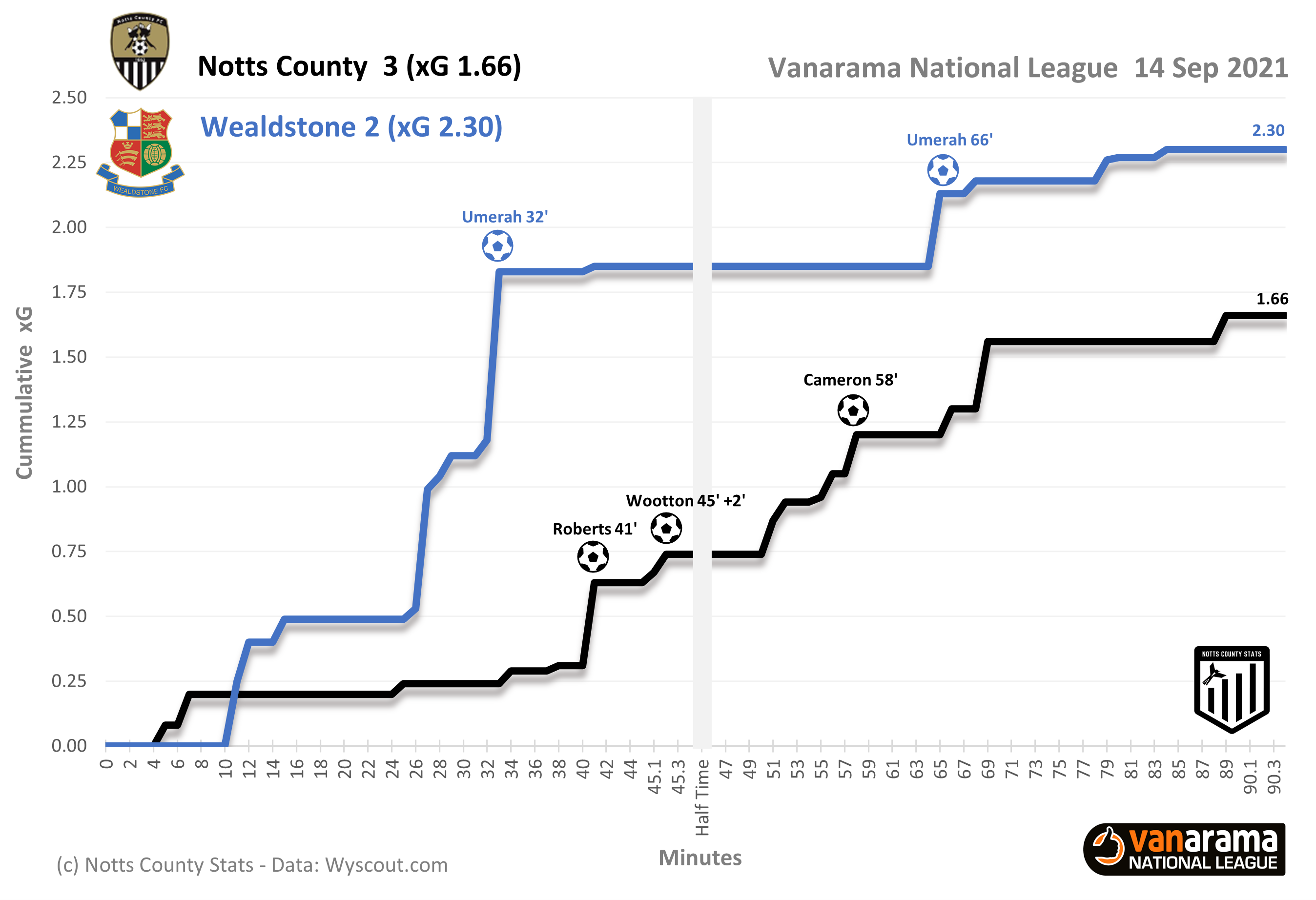 Its also interesting that Notts had more chances but with much lower xG whereas Wealdstone had several very big chances that they didn't take. This would indicate that Notts were more clinical in front of goal.