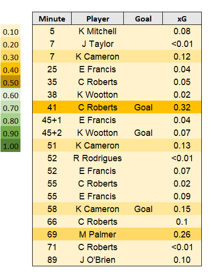 Player xG below. I've added a colour coded scale from 0.01 to 1.00 to help identify any big chances.