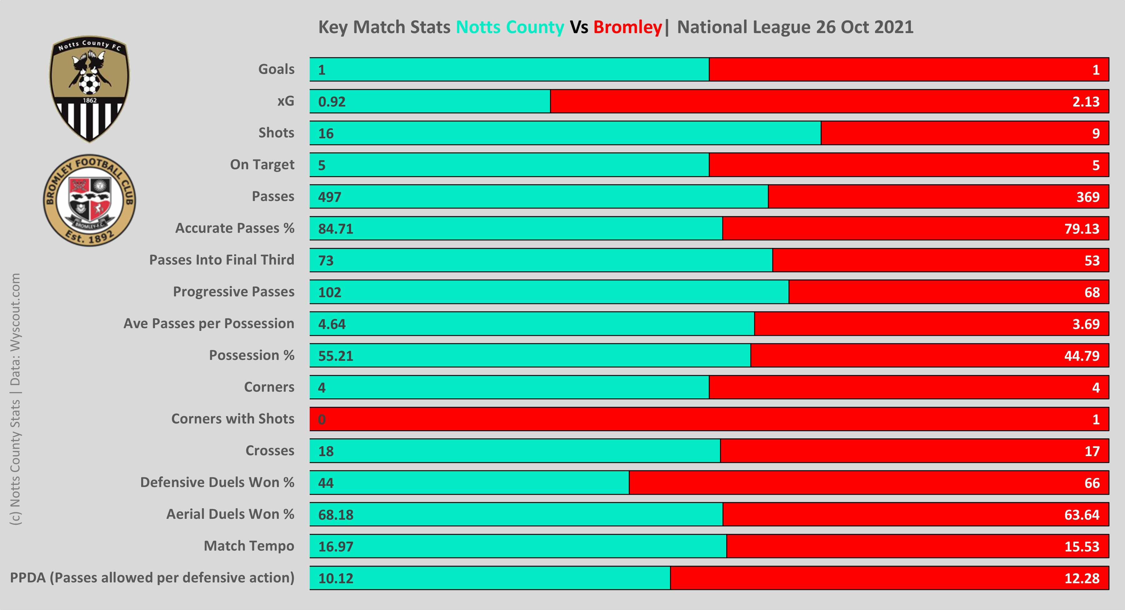 As expected Notts come out on top in all of the construction metrics, so anything to do with progressive build up play. One real shocker is the xG values, particularly for Bromley, but we'll come back to that shortly.