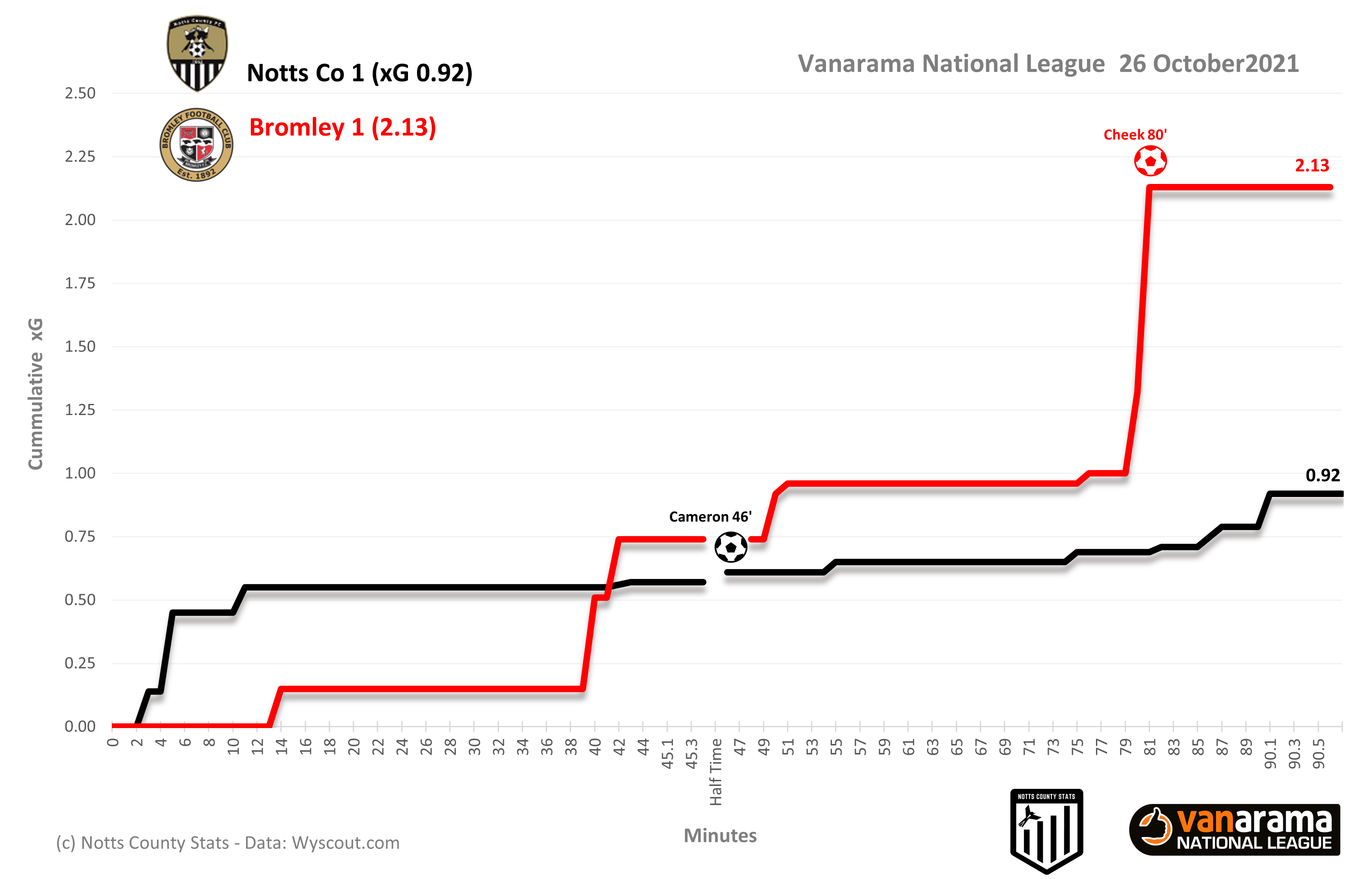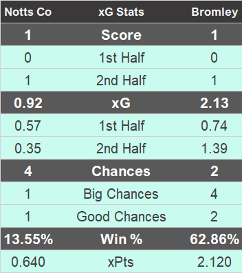 This is something we witnessed last night, with Bromley packing the 6 yard box with players at every set piece opportunity. For most of the match Notts did an excellent job of keeping Bromley at bay and it was a bit of fortune for the visitors that provided them with the goal when Michael Cheek was able to convert from about a yard out for a goal with a very high xG value of 0.81 which contributed massively to Bromley's xG match total.