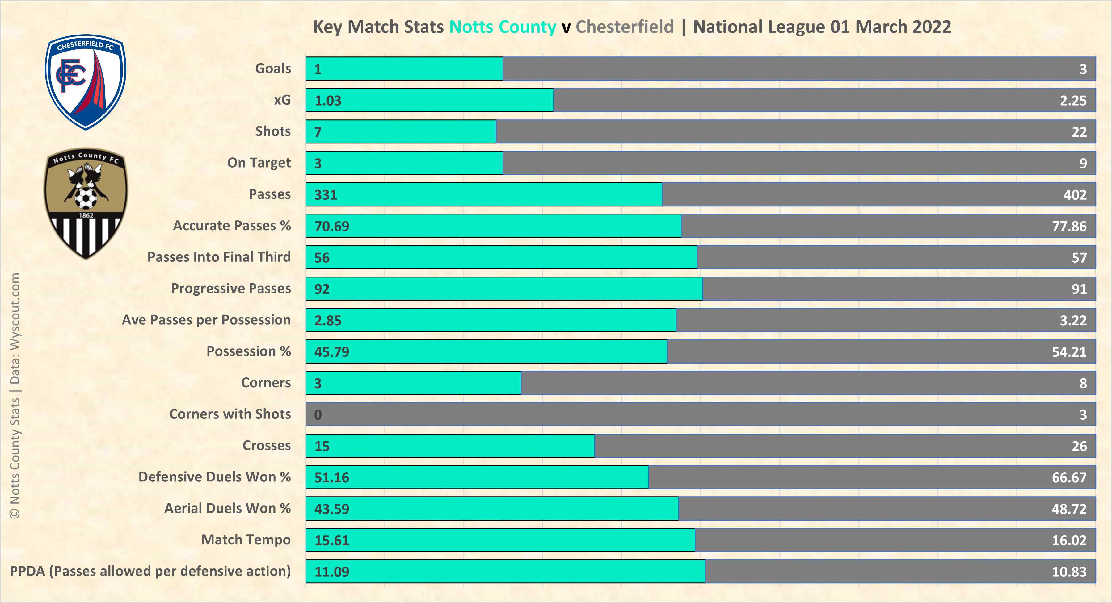 Worst set of stats for some time for Notts. Second best in most areas but most notably in the construction stats where possession, passes and pass accuracy were well below usual standards.