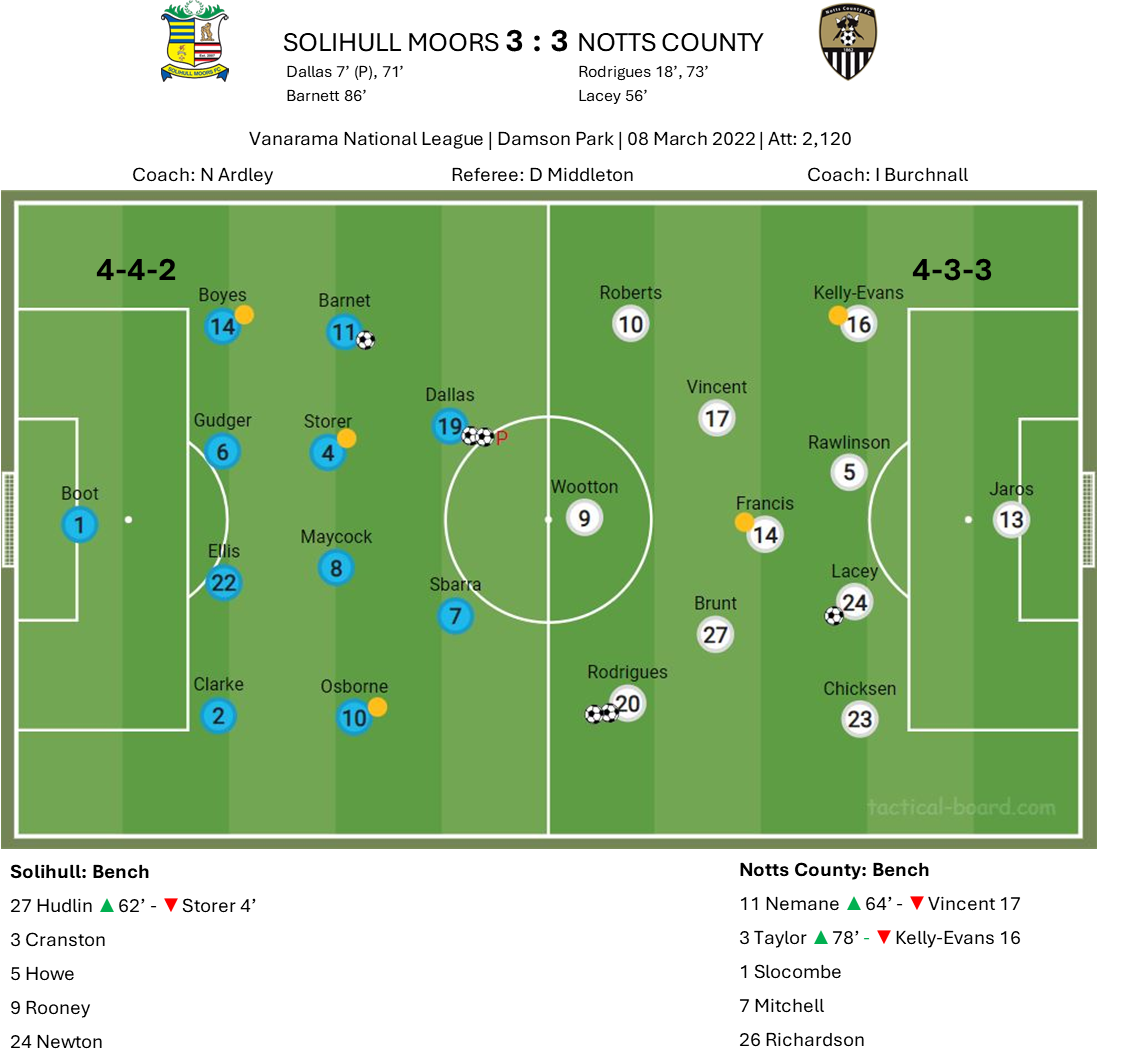 However, Notts rallied and against the odds twice took the lead, but just couldn't do enough to secure all three points as 22 year old Moors winger Ryan Barnett somehow managed to convert a speculative half volley from 25 yards out to level the scores on 86 minutes.