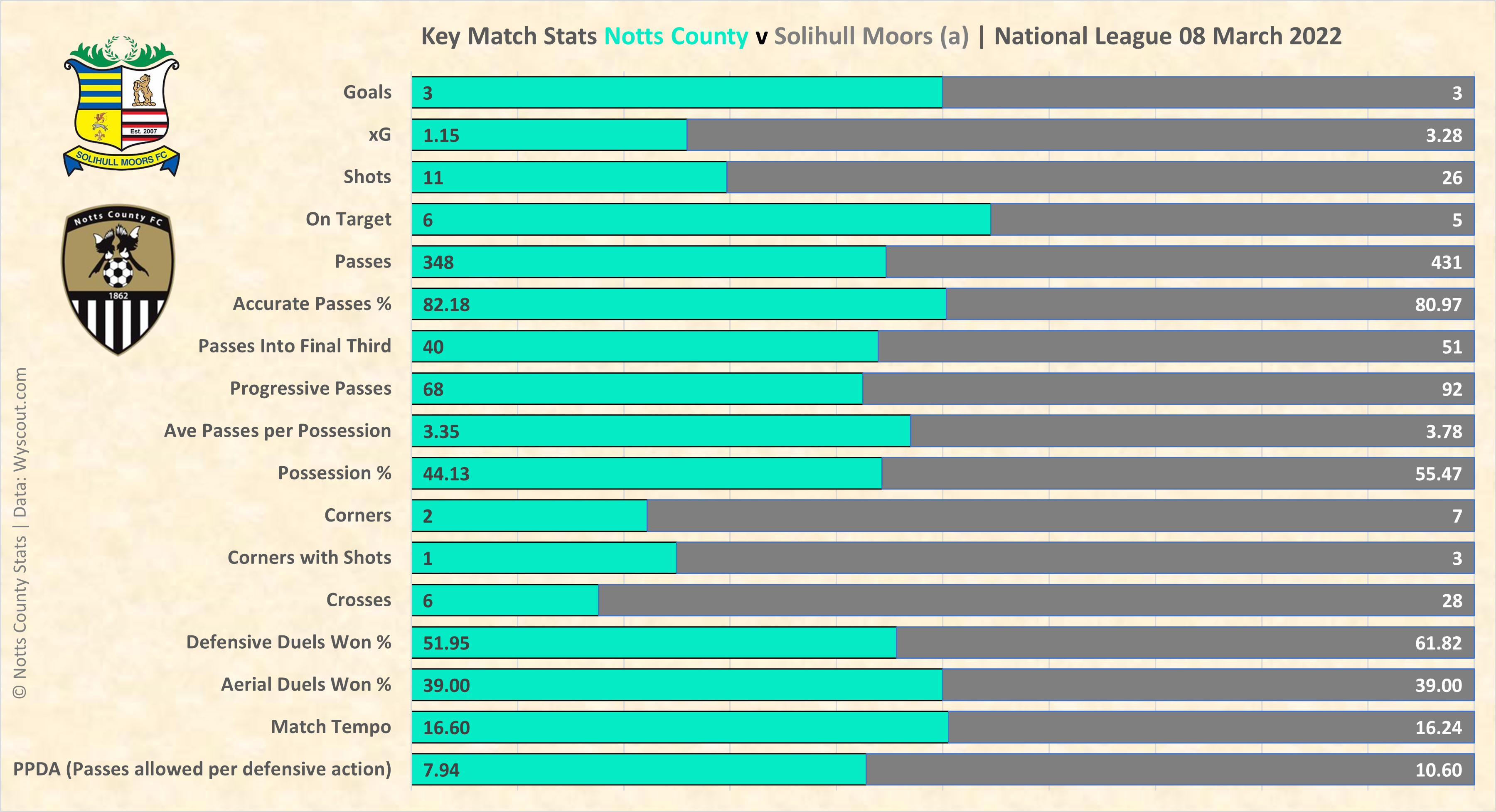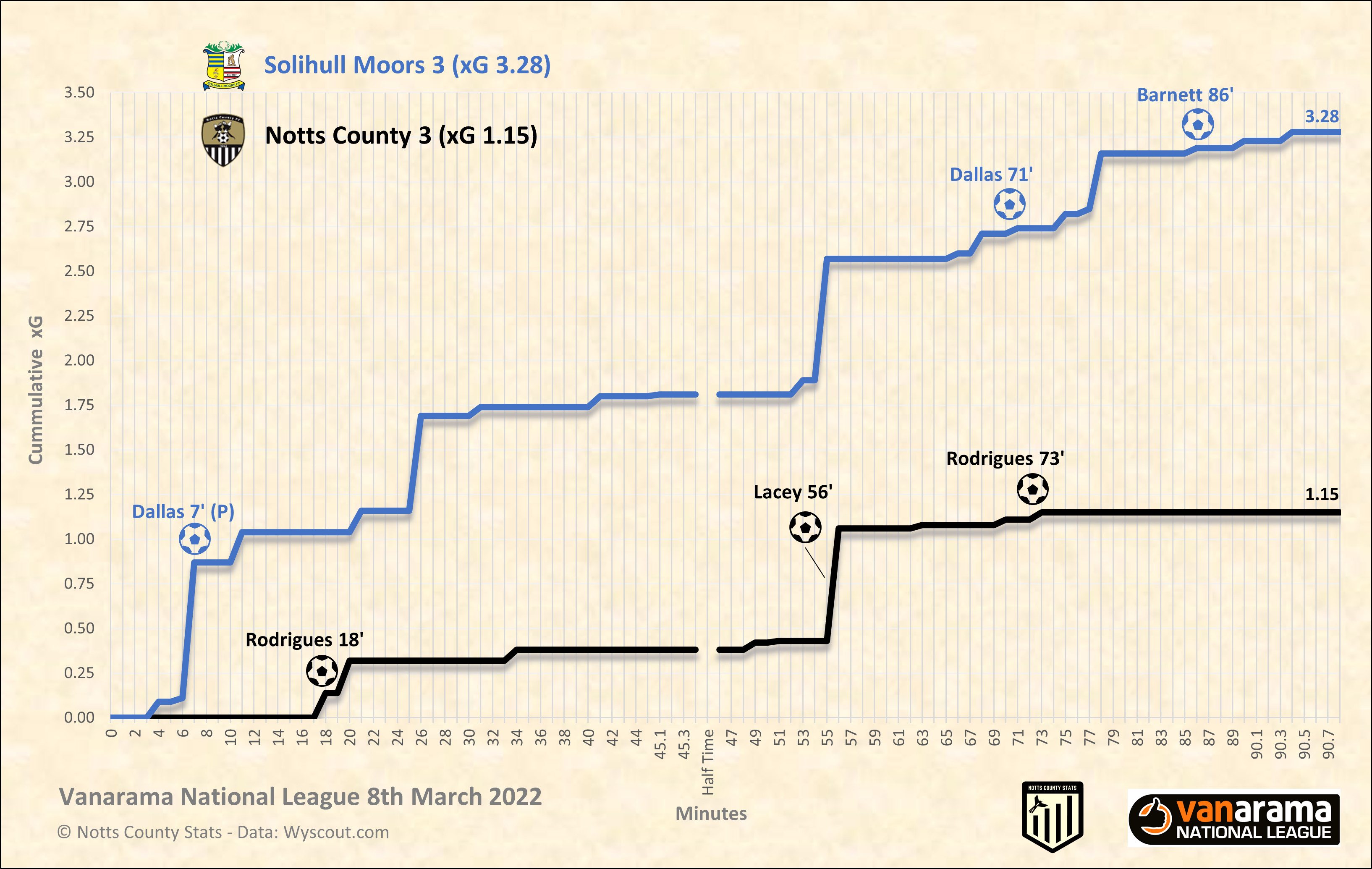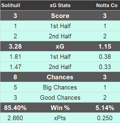 Expected goals and clear to see how open and attacking the game was. Solihull clearly on top but the penalty skews the data a bit by adding 0.76 to their tally. That said they were still good value regardless.