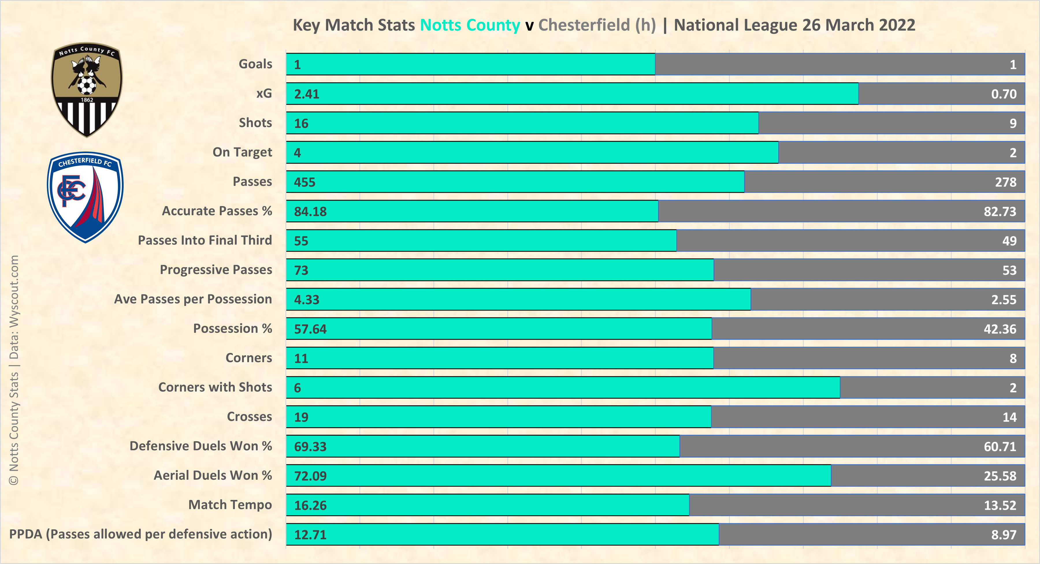 Make of the above what you will but Notts on top in every area, except the score.