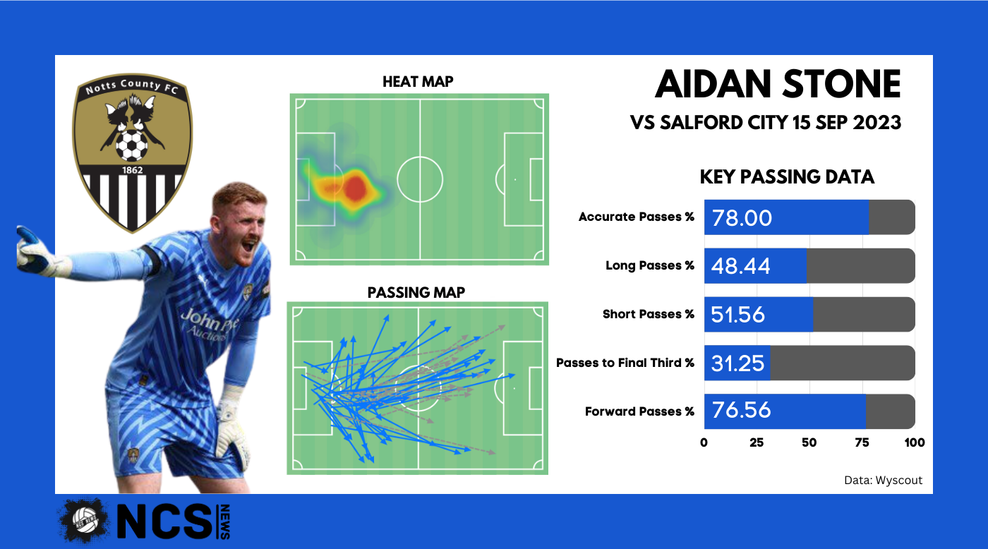 Another side to Notts game we are seeing is a more direct approach, and this is something that the players, especially those who were at the club last season, have had to adapt to in League Two against a more physical opposition. We need to mention Aidan Stone here as it is him who is playing a leading role in dictating the build up from the back, understanding when to play out from the back and when to go long. We will take a closer look at this later in the report.